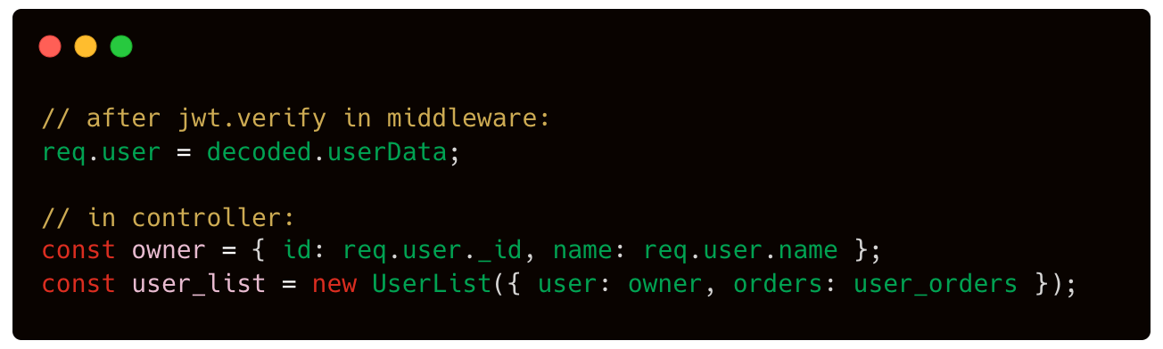 In the checkToken middleware, attach the decoded token to req.user and ignore body.user entirely. See the example below.Â